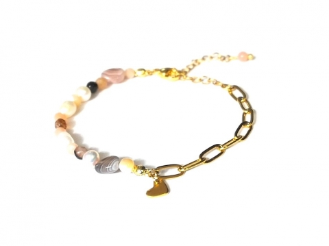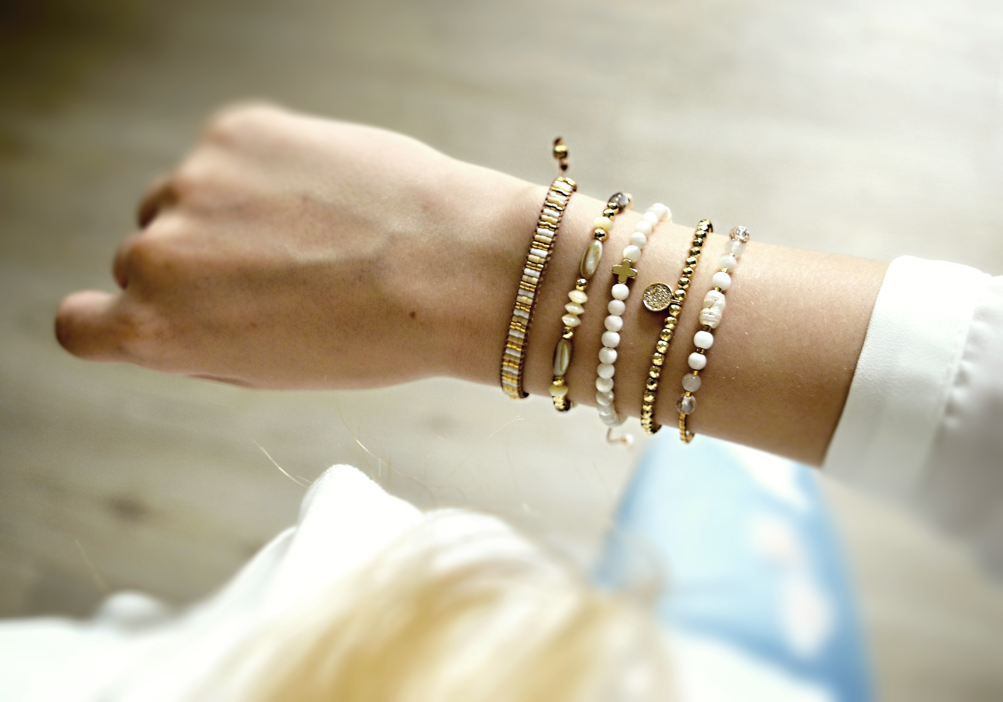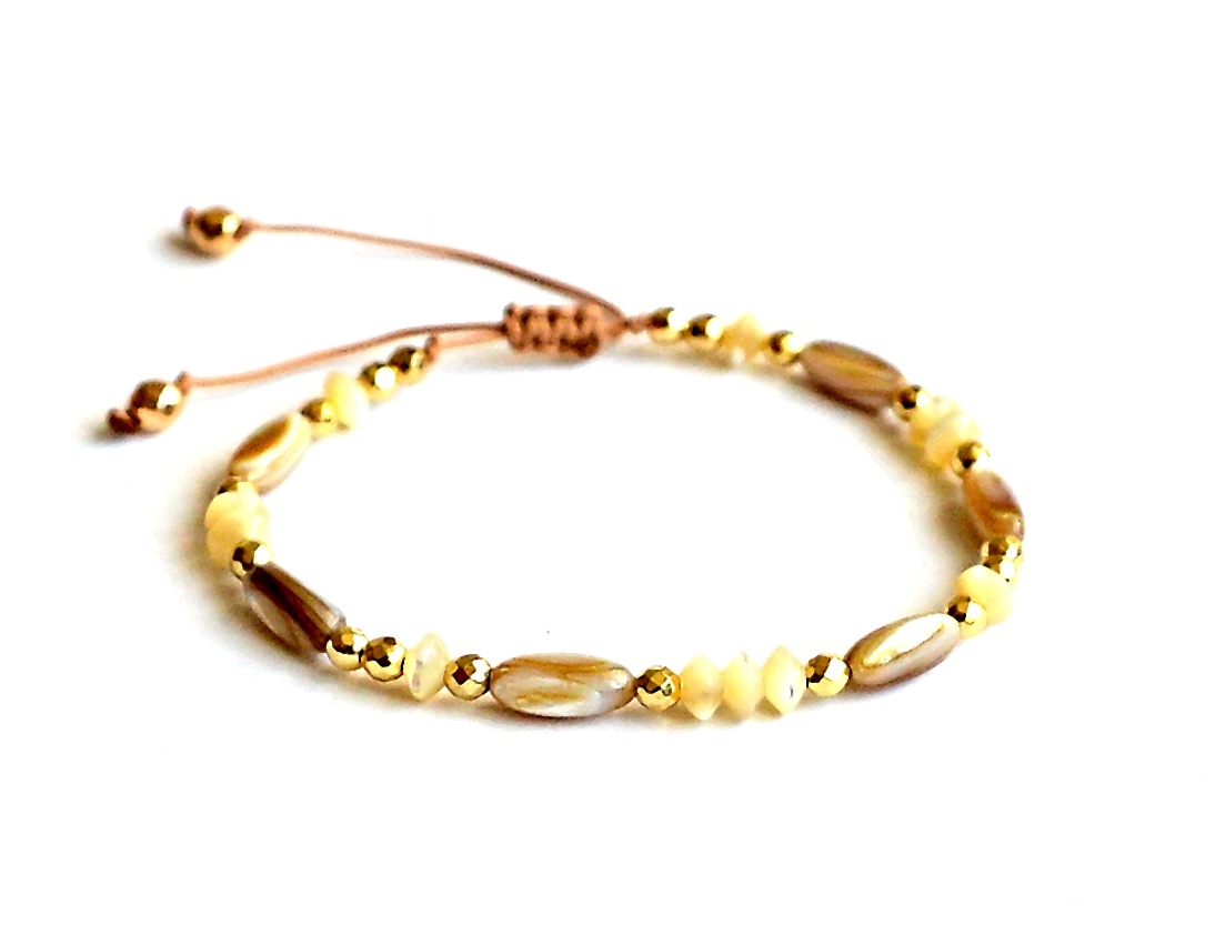 +420 737 700 147Dámský stahovací náramek BRYXI je vyroben v kombinaci přírodních korálků trochus a broušených korálků pozlaceného hematitu.