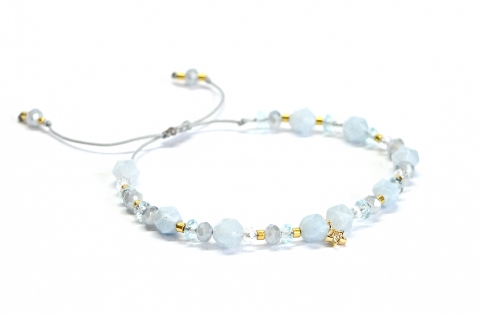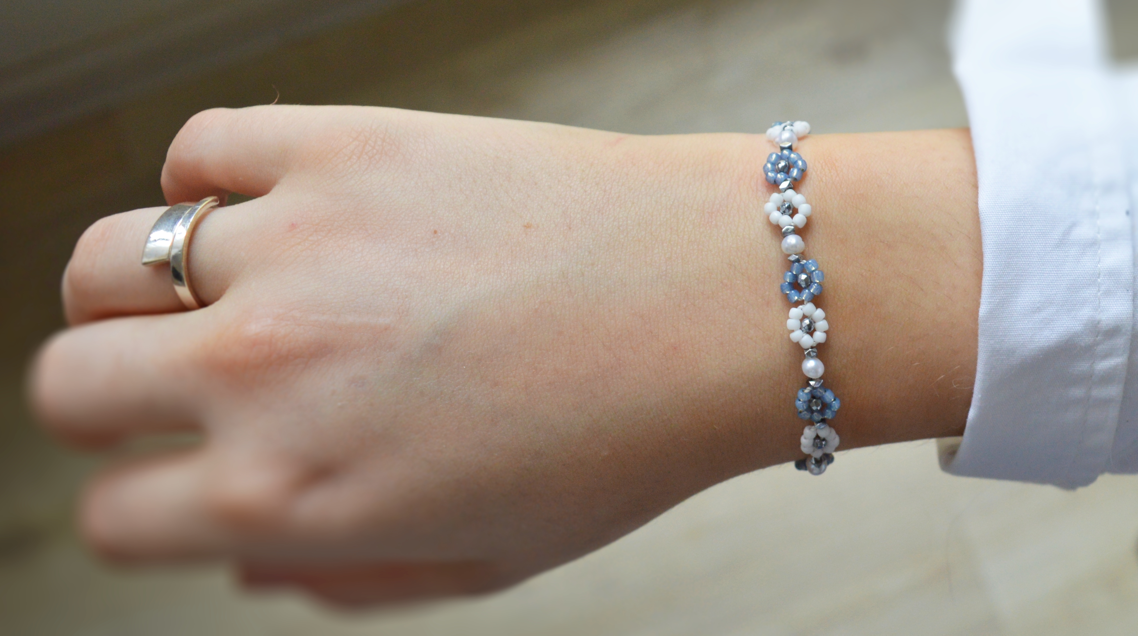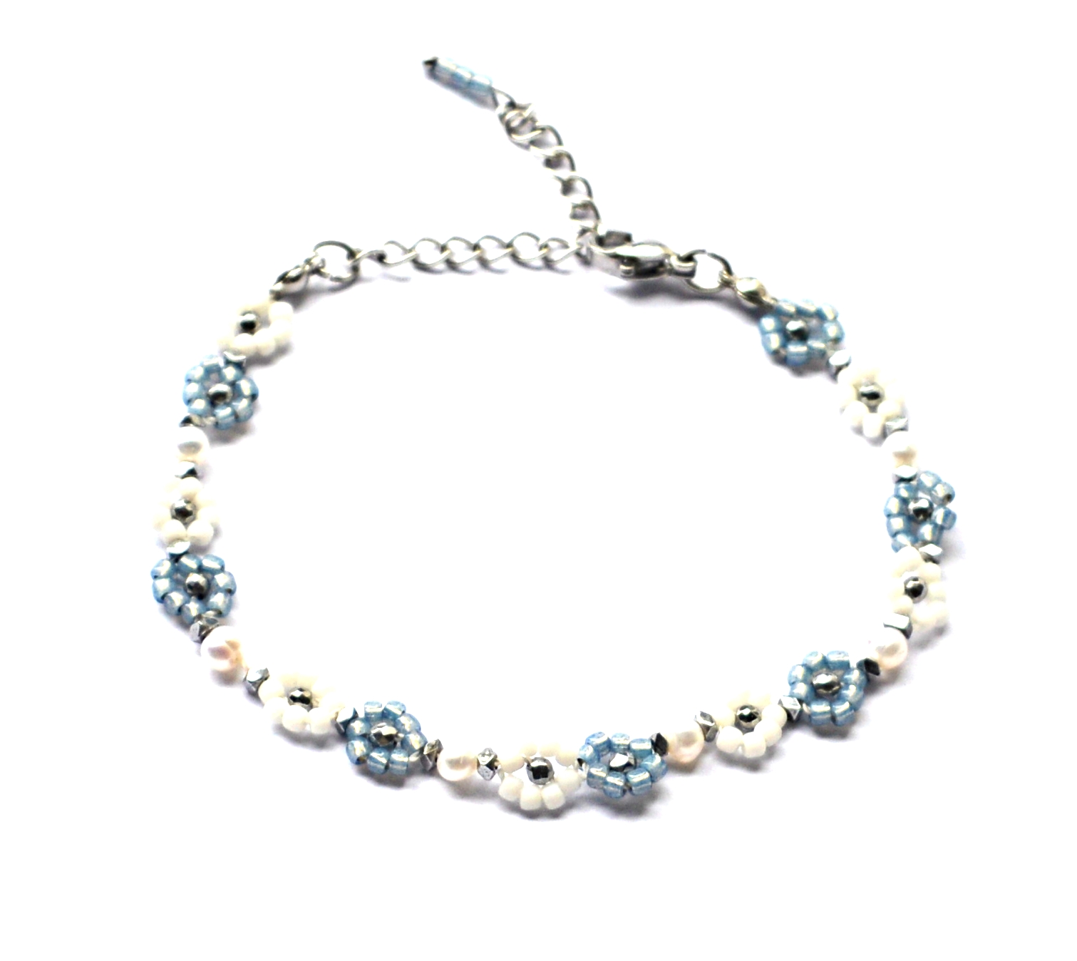 +420 737 700 147Jemný elegantní korálkový náramek značky BRYXI s drobnými zlatými detaily a krémovými květy kopretin.