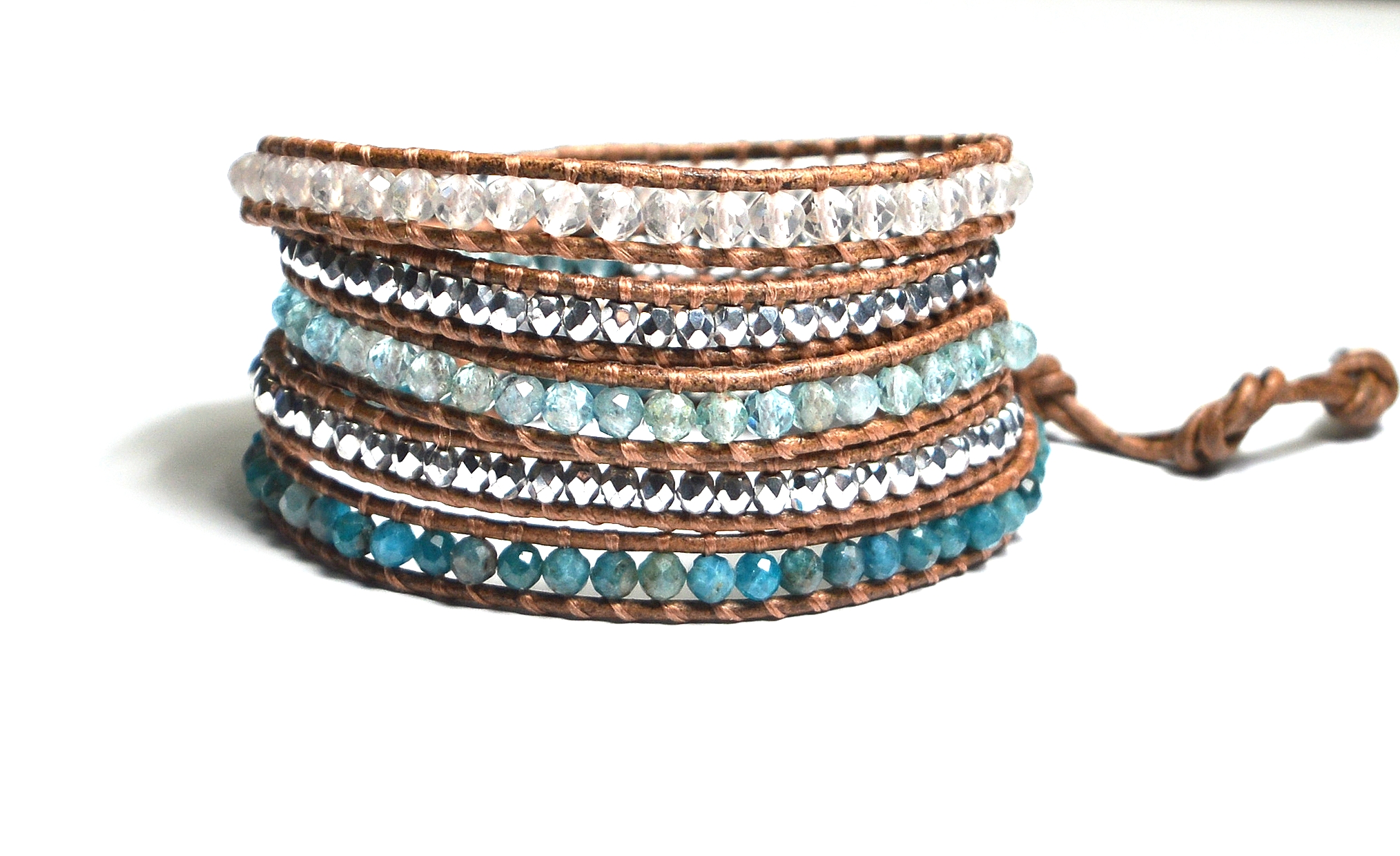 Náramek WRAP z drahých kamenů a skleněných krystalů značky BRYXI je vyroben tak, aby vytvořil pět linií kolem vašeho zápěstí.