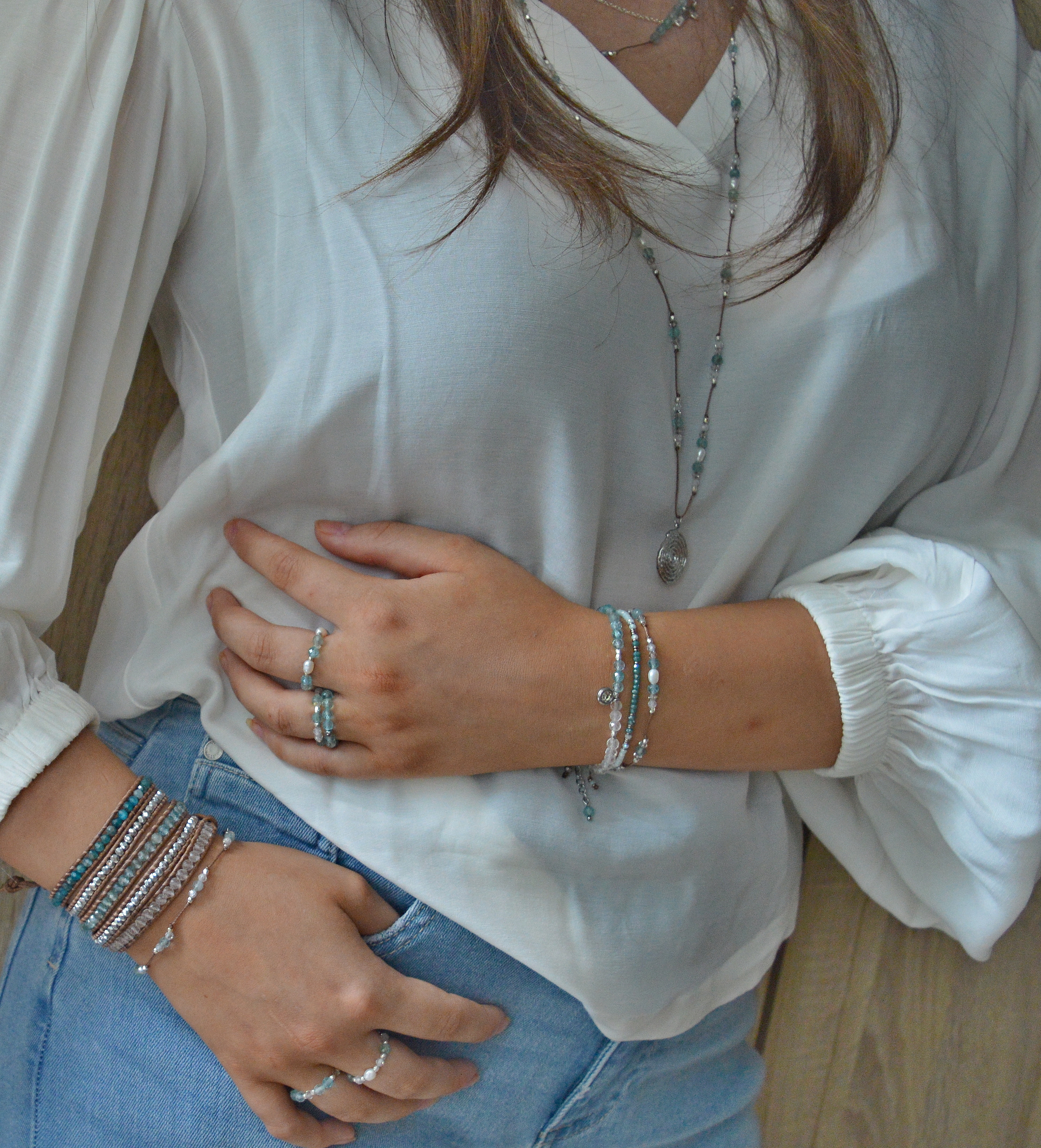 +420 737 700 147Minimalistický a elegantní náramek značky BRYXI je ručně vyroben ze skleněných krystalů, broušených korálků světlého apatitu a komponentů z chirurgické oceli.