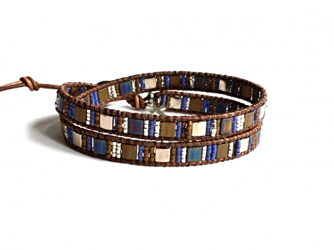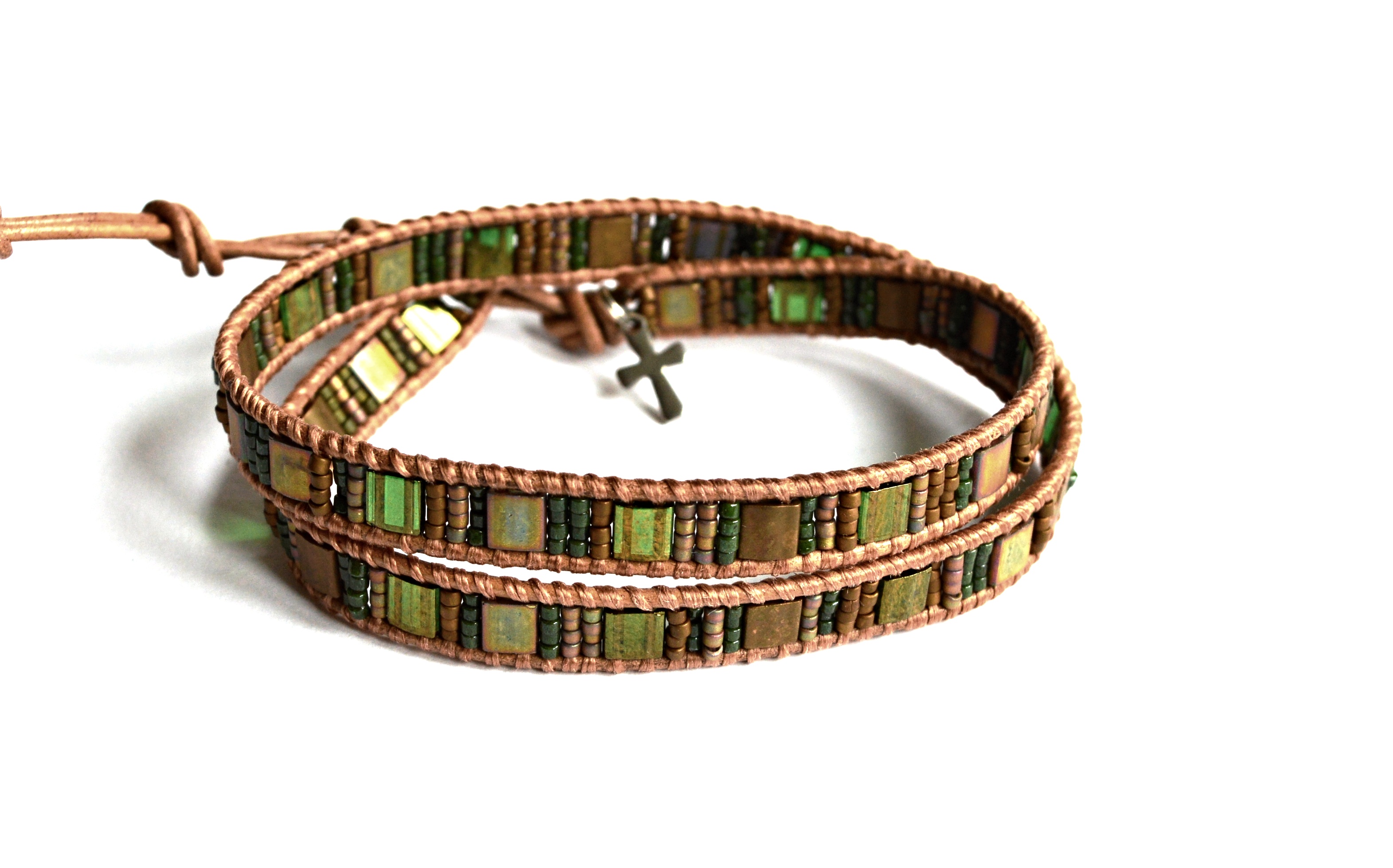 Je vyroben ze skleněných korálků ručně všitých v kulaté kůži. Součástí náramku je přívěsek z chirurgické oceli, který lze na přání odstranit.